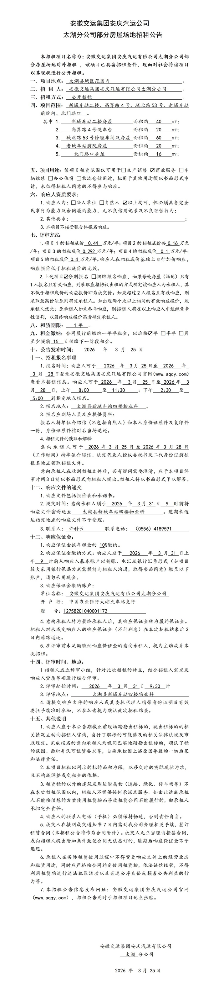 太湖分公司部分房屋場(chǎng)地招租公告