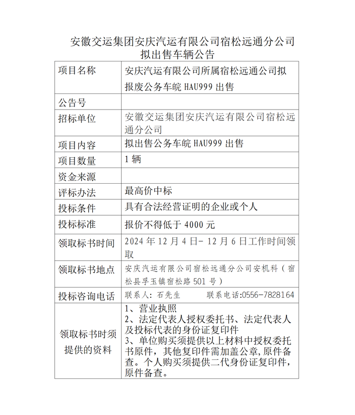 宿松遠(yuǎn)通分公司擬出售車輛公告