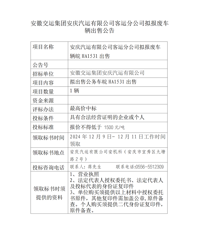 安慶汽運有限公司客運分公司擬報廢車輛出售公告